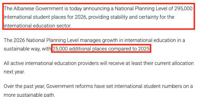 8月4日,澳大利亚教育部正式宣布:2026年国际学生国家规划配额将提升至29.5万人,比2025年的27万增加2.5万个名额,涨幅达9%。这是自疫情后澳洲实施配额限制以来首次显著扩招。但细读政策条款发现,想要享受扩招红利,大学和学生都需要满足新的“规则”。01. 政策核心:扩招背后的战略转向教育部长Jason Clare在声明中明确表